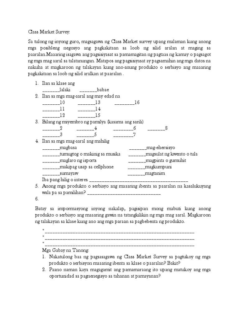 Magsagawa ng survey da inyong tahanan. Magkano ang budget para sa isang buwanb. Katulong ang mga magulang sagutin ng buong katapatan ang sumusunod na tanong.